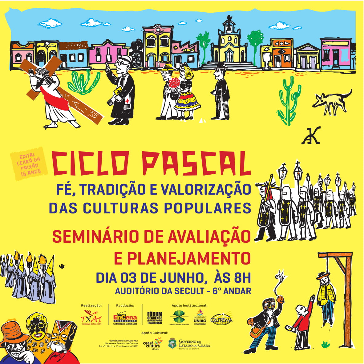 A Secretaria da Cultura do Estado do Ceará - Secult realiza, no dia 03 de junho, no local Auditório da SECULT 6º Andar, das 8h às 13h, o III Seminário de Avaliação e Planejamento Ceará da Paixão, com produção da Associação Txai Cultura e Arte - ATXAICA, entidade contemplada no XV Edital Ceará da Paixão 2019. A atividade se propõe a avaliar o Ciclo Pascal e traçar caminhos e diretrizes para o Ciclo de 2020.